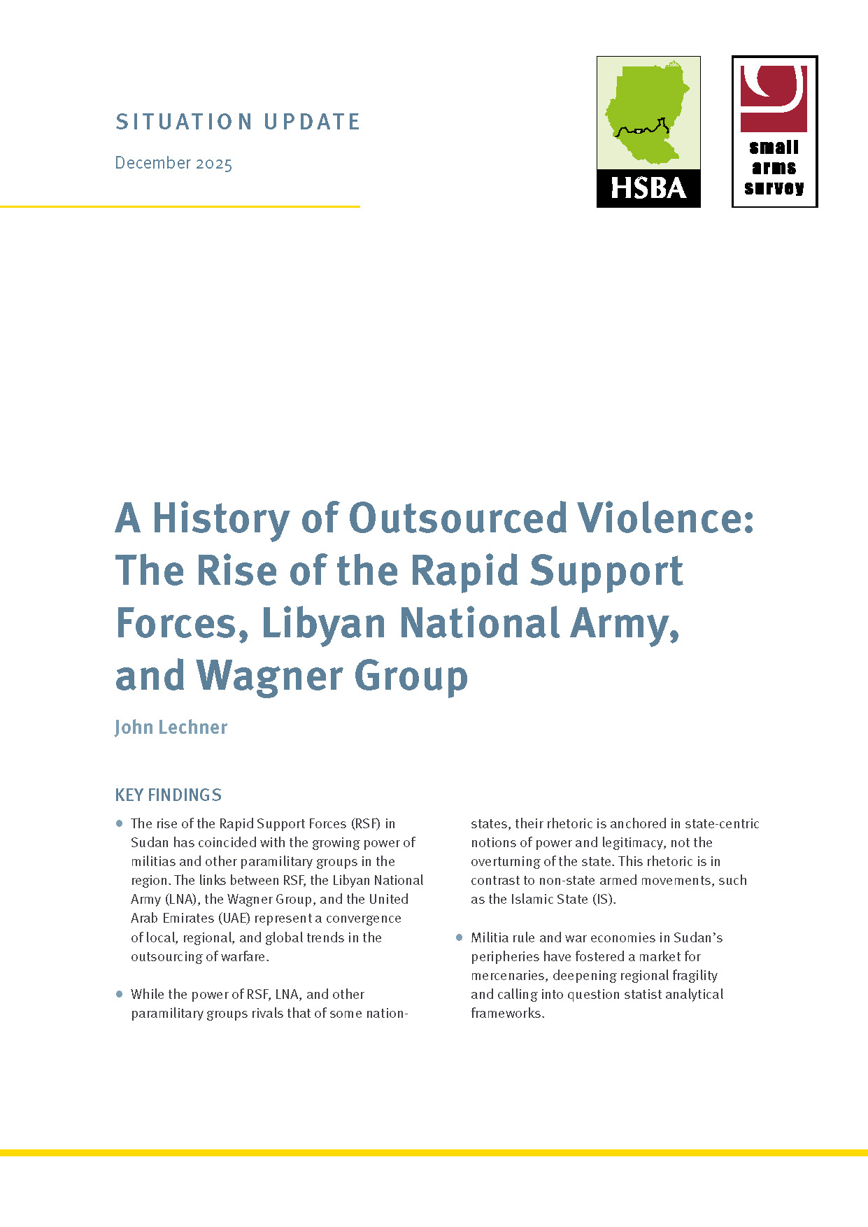 A History of Outsourced Violence: The Rise of the Rapid Support Forces, Libyan National Army, and Wagner Group—a new Situation Update from the Small Arms Survey’s Human Security Baseline Assessment for Sudan and South Sudan (HSBA) project—analyses the history of outsourced violence in Sudan, and how the resurgence of mercenary economies and transactional alliances in Sudan, Chad, Libya, and the Central African Republic challenges peacebuilding in the region.