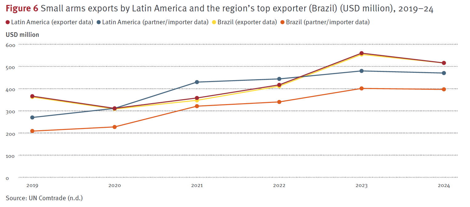 Latin America is a more discreet actor in the reported global trade in small arms. The region accounted for 6.3% of global small arms exports during 2019–24. While this proportion illustrates the region’s limited weight in global small arms exports, the annual value of reported exports from the region increased by 41% between 2019 and 2024 (see Figure 6).