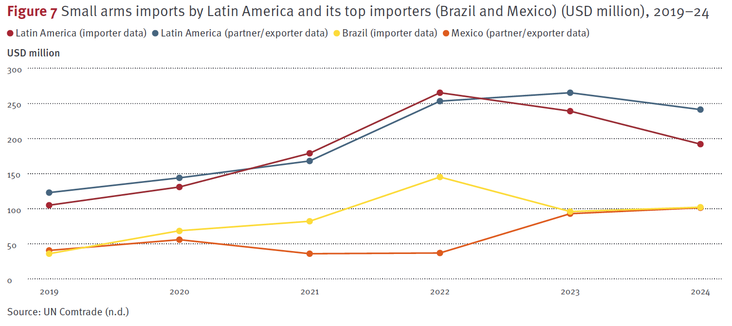 Indeed, annual imports by the region’s main importing countries, and notably Brazil, fluctuated markedly during this period, probably reflecting major acquisitions or contracts, or regulatory changes, during peak years. The value of Brazil’s reported imports increased by a ratio of 1 to 4 (times 4.1) from 2020 to 2022, likely influenced by new government policies that deregulated firearms possession by civilians and facilitated imports from foreign companies (for instance, through the removal of protections for the national industry).[2] Imports reported by Brazil subsequently decreased by 31% between 2022 and 2024.