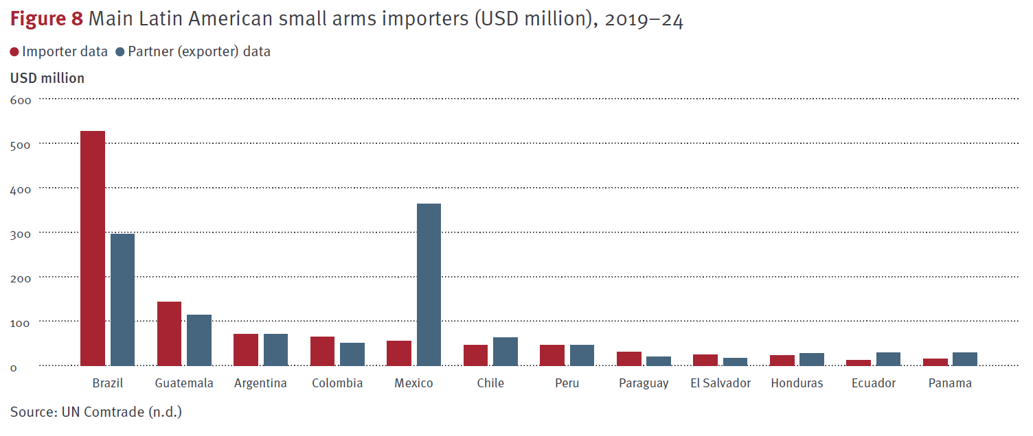 Latin America accounted for 2.8% of reported global small arms imports during the period 2019–24. While this figure suggests limited small arms imports by the region from a global perspective, these imports more than doubled (times 2.5) between 2019 and 2022, when they reached a total of almost USD 270 million (see Figure 7). The region’s imports subsequently decreased by 27% between 2022 and 2024, suggesting a certain volatility from year to year.
