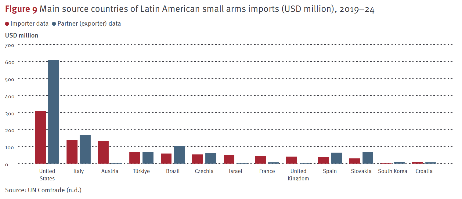 The United States, Italy, Austria, and Brazil are the only countries to have exported more than USD 100 million of small arms to Latin America between 2019 and 2024, based on either importer or partner data (see Figure 9). Brazil is therefore a significant exporter of small arms to the region itself, in addition to being the world’s fifth-largest arms exporter (see above).