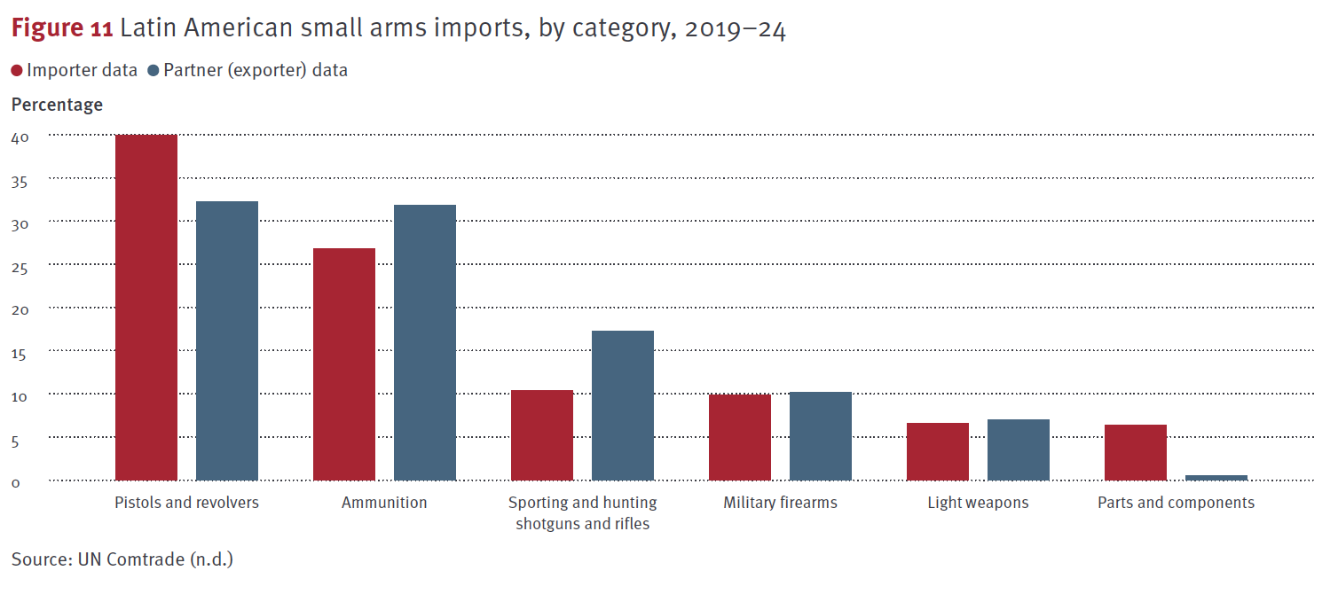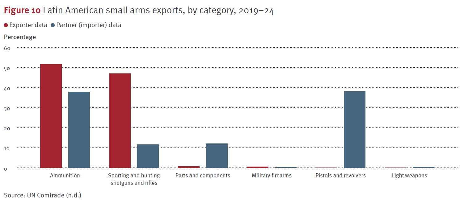 Looking at the main UN Comtrade weapon categories, countries in Latin America almost exclusively reported exports of ammunition (52% of all reported regional exports) and sporting and hunting shotguns and rifles (47%). Data from the region’s trading partners provides a different picture, however, with pistols and revolvers and ammunition each accounting for about 38% of all imports reported to originate from Latin American countries (see Figure 10). It is unclear whether these discrepancies are due to certain transfers being under-reported, miscategorized, or categorized differently by Latin American states and their partners.