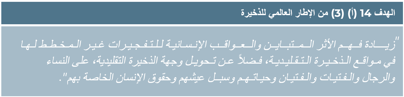 ومن شأن هذا البحث أن يؤدي مع مرور الوقت إلى تطوير منهجيات تقييم أكثر فعالية، وهو أمر ضروري لتعزيز قدرات السلطات الوطنية في إطار الهدف 4. كما يمكن لحوار أكثر استنارة وشمولًا بشأن خطورة المخاطر والعواقب المحتملة للانفجارات العرضية في مخازن الذخائر أن يدفع السلطات الوطنية نحو تحديث خطط الاستجابة للطوارئ وتحسين تدابير التخفيف من المخاطر، لا سيما من خلال تحسين إدارة مخزونات الذخائر. وعلاوة على ذلك، فإن معالجة الشواغل الأساسية للمرأة تُعد عنصرًا محوريًا لضمان مشاركتهن بشكل كامل ومتساوٍ وهادف وفعّال في تنفيذ الإطار العالمي للذخيرة.