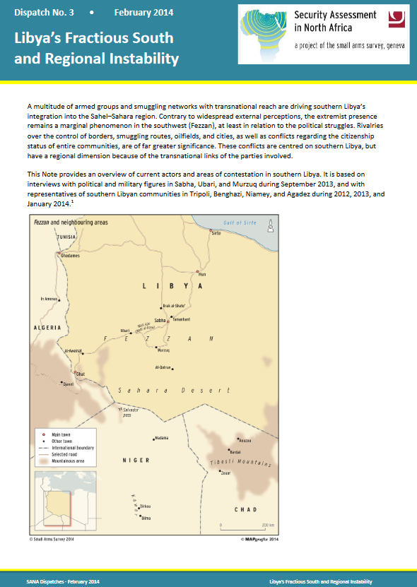 'Libya’s Fractious South and Regional Instability', a new online Dispatch from the Small Arms Survey's Security Assessment in North Africa (SANA) project, provides an overview of current actors and areas of contestation in southern Libya. It is based on interviews with political and military figures in Sabha, Ubari, and Murzuq during September 2013, and with representatives of southern Libyan communities in Tripoli, Benghazi, Niamey, and Agadez during 2012, 2013, and January 2014.