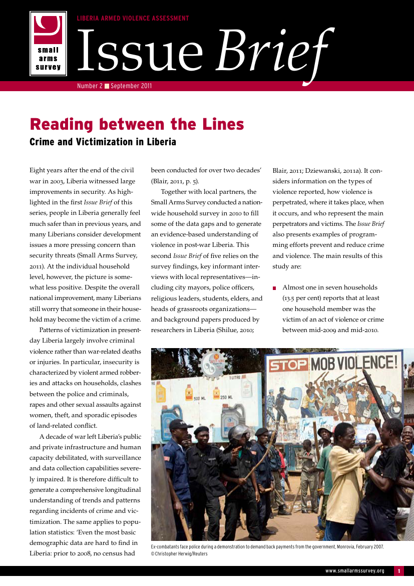 Together with local partners, the Small Arms Survey conducted a nationwide household survey in 2010 to fill some of the data gaps and to generate an evidence-based understanding of violence in post-war Liberia. This second Issue Brief of five relies on the survey findings, key informant interviews with local representatives—including city mayors, police officers, religious leaders, students, elders, and heads of grassroots organizations— and background papers produced by researchers in Liberia (Shilue, 2010; Blair, 2011; Dziewanski, 2011a). It considers information on the types of violence reported, how violence is perpetrated, where it takes place, when it occurs, and who represent the main perpetrators and victims. Reading between the Lines: Crime and Victimization in Liberia also presents examples of programming efforts prevent and reduce crime and violence.